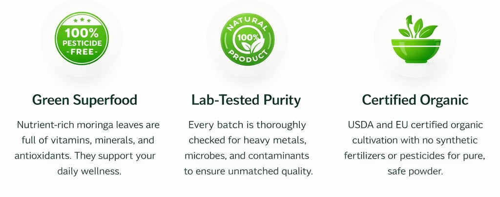 Morvit’s moringa powder is 100% leaf-derived, with no stems, fillers, excipients, or carriers added. It contains no preservatives, artificial colors, or additives, aligning with clean-label and organic product requirements. Strict batch-level controls and traceability systems are maintained from sourcing through final milling, ensuring consistency, reproducibility, and compliance with EU, USA, and Middle East food safety and organic standards.