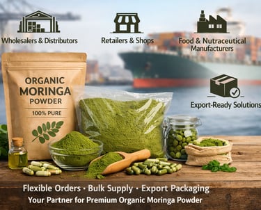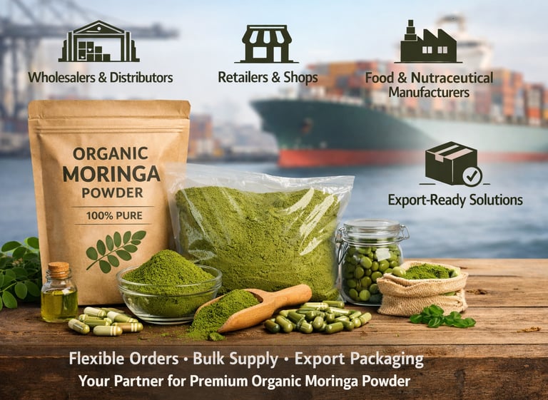 We offer flexible order volumes, competitive bulk pricing, and export-compliant packaging, enabling our partners to source high-quality organic moringa powder efficiently and scale their business with confidence.